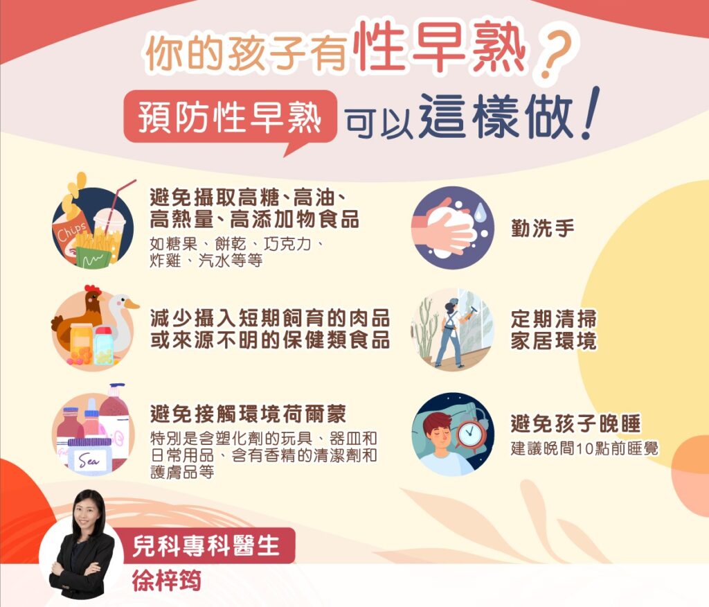 小朋友要有一個良好的的生長發育,必須培養出一個均衡飲食、健康和規律的生活模式。盡量避免小孩子進食或接觸一些外來激素或者是環境荷爾蒙,特別是含塑化劑的玩具、器皿和日常用品。